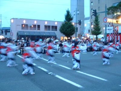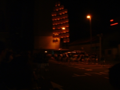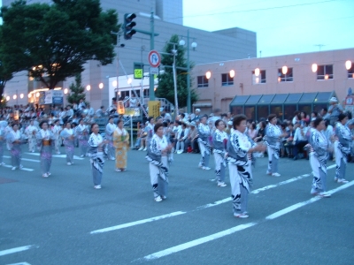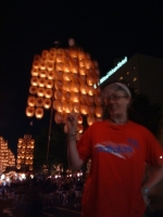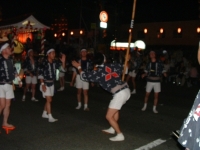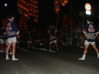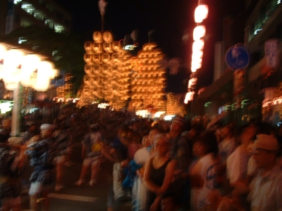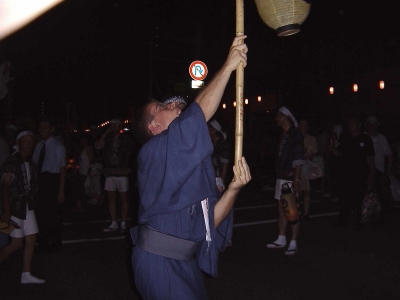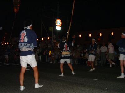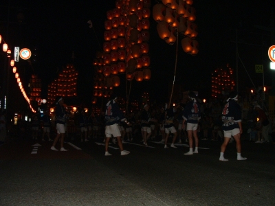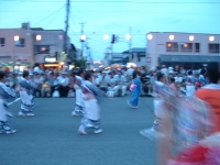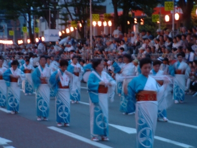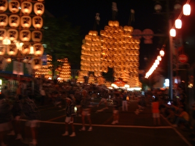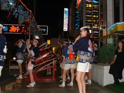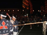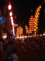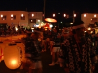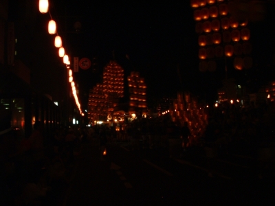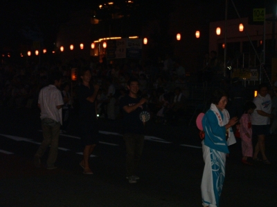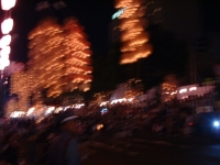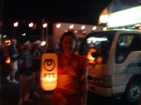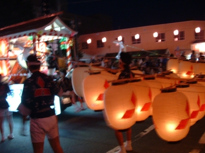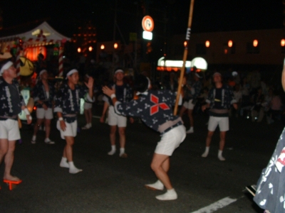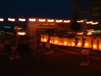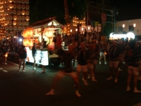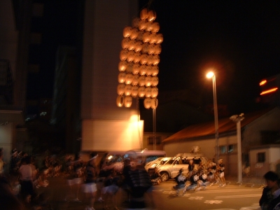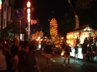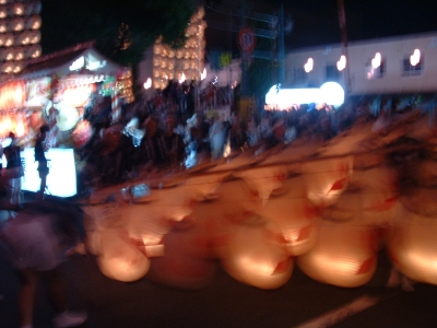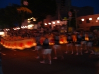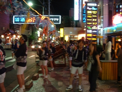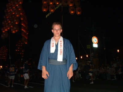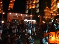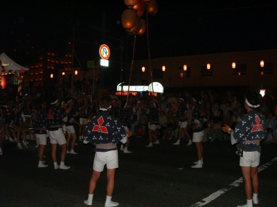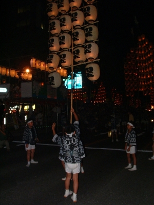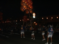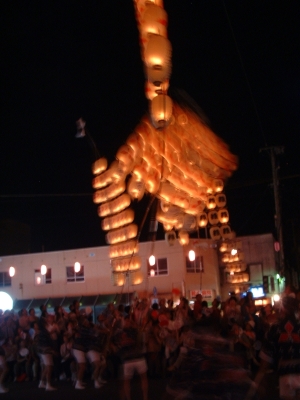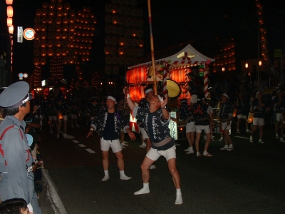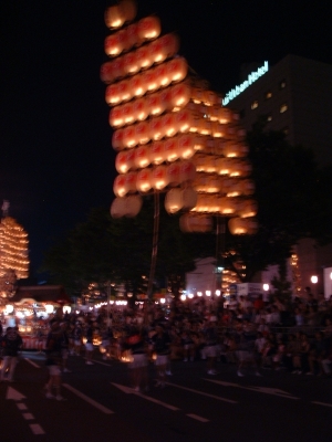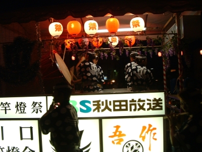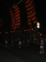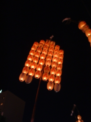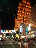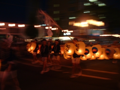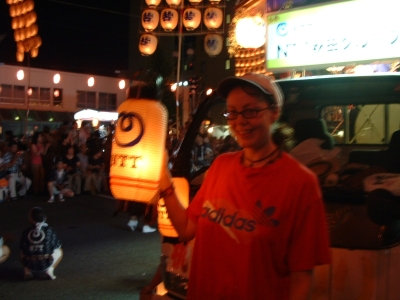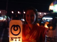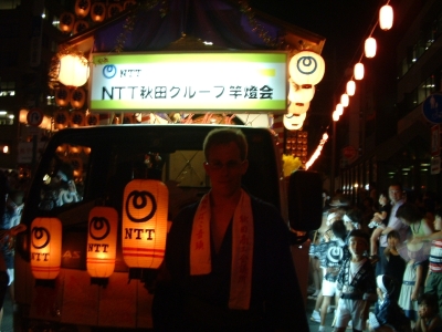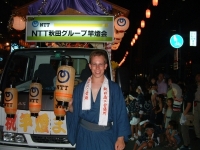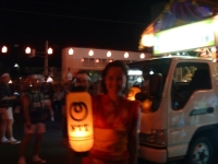 The Kanto Festival consists of balancing large poles hung with lanterns on your palm, forehead, shoulders, lower back and hips, in order of difficulty. While the poles (kanto) represent the ears and stalks of the rice plant, the lanterns themselves represent bales of rice, an important crop in Tohoku. While these men balance the poles, their drummers and flutists keep rhythm and the people in the crowd shout "Dokkoisho! Dokkoisho!". To these already unstable structures, the men keep feeding more poles under the main pole, making the whole construction taller and more tipsy. Then, to make it even harder, some of them put on single plank sandals (a sandal made like a geta, but instead of 2 small planks, there is one large one in the middle) and balance on the sandals while balancing a pole. Some also get down all the way to the ground, balancing the pole on their back, hip or shoulder. While the men make it look easy, I got a chance to try this. The poles are up to 12 meters (13 yards) tall, with 24-46 lanterns, weighing in at about 50 kilograms (110 pounds). I first tried one of the big poles. While I was able to hold it myself, I couldn't balance it at all by myself. Then I tried one of the small poles, about half the size and weight. This one I was able to balance for about 3 seconds by myself before losing it. This is nearly impossible! I have an incredible amount of respect for the men who pull this off. We got a lot of compliments for our garb, and several groups gave me items from their group, like scarves and fans. I also got invited into the NTT truck who drove me around while I played the big drums.