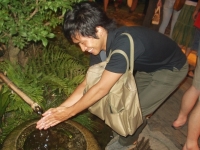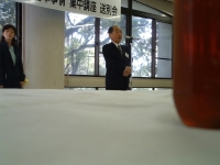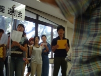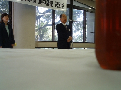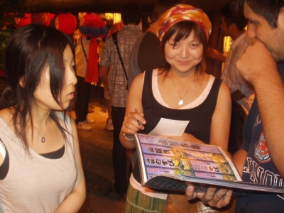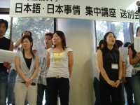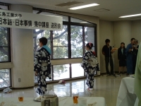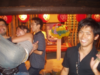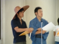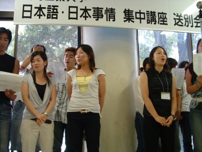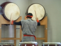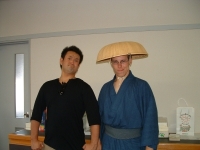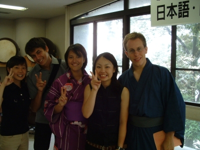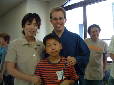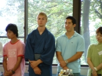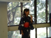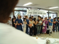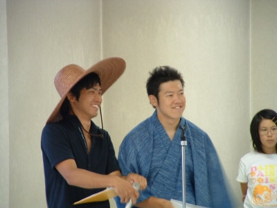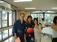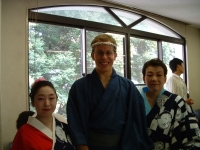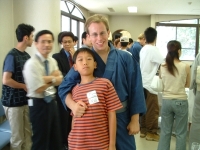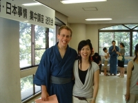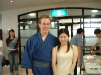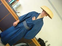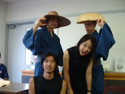 The farewell party was bittersweet. I wore my yukata and despaired about not having the right shoes (in fact, I had even forgotten my sandals, making a stockinged feet appearance very likely). However, my lab group, listening to my musings about having a pair of tabi boots (jikatabi) arrived with a gift - a set in my size! Thanks to them, I am the proud owner of one of my new favorite types of footwear - too bad I can't wear them often in the states. I had a blast talking with all of the people I met here. We also got to see some taiko drummers and a short Kabuki-style dance piece. I also got to see one of my host families again as the Kim family showed up. We then sang a few songs, then it was all over.