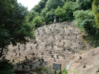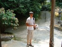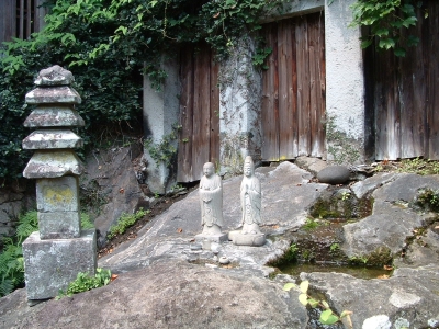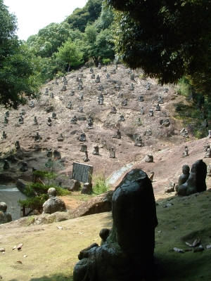 We walked deeper into the depths of Reigan-Do, and back in time. As we wound the old moss covered steps of broken rock and natural limestone, I was struck by just how remote this area was, as well as the power in the air. Around a corner lies a tall hill, with ancient Buddahs in niches set along the face. Each Buddah is unique, and there is an example of every Buddah in the Japanese system here. Some have broken, both on the face or lost the head completely. Some are so worn that it is impossible to make out their features. Yet each has its own personality and story - a minature play set in stone. At the end of the Buddahs lies the larger area set aside for the Vairochina (sp?), standing wise and absolute over the rest. The cave of Reigan-Do is set up and above, a high niche that in must have had to be climbed to enter in the days before concrete stairs were installed. It is not very large, only 10 foot by 15 foot or so, and has a beautiful view through the cedar pines towards the mountains. It is here that Miyamoto Musashi penned his famous work, Go Rin No Sho, or The Book of the Five Rings. While incorporating elements of both Buddhist and Bushido, Go Rin No Sho espouses a philosophy wholely Musashi's own - that of instantanious readiness and reaction, unconcerned with both the shade of emotion or the situation of yourself, while taking into account both. I can envision someone writing an all-encompassing work in a place like this - where nature itself surrounds everything.