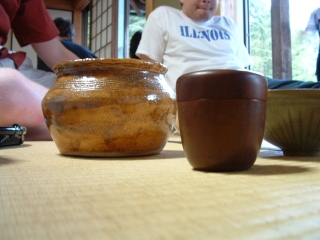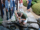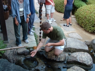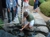 Outside the tea house, you wash before entering. The washing is both for cleanliness and ritual - there's a certain way to wash. First, you wash your left hand, then your right, then you pantomime drinking some water (you used to actually drink it, but everyone washes their hands in the same water - not clean!), then you pour the rest out via rocking the dipper up and away from you. This method of washing is repeated at many Shinto shrines.