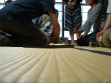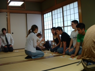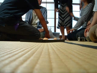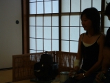 Once entering, you walk in only on stocking feet. This applies to any tatami matted area in all of Japan (and even the world - I would kill someone if they walked on a tatami I had with their shoes). The tokonoma is a focal point of the room as are the split level shelves (look up the name of these). You find a spot on the floor and sit seiza style, knees underneath you, sitting on your heels and balancing on your shins.
