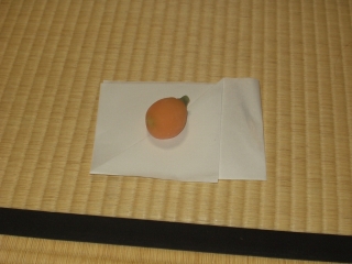 The first serving is mochi, a sticky sweet treat made from glutenous rice paste and flavoring. I know it sounds gross, but it is incredibly delicious. A sweet treat like this is given to offset the slightly bitter taste of the tea.