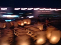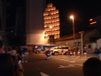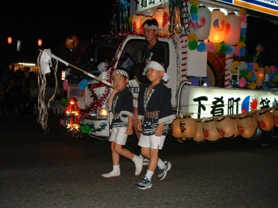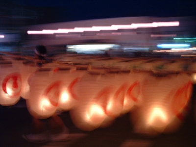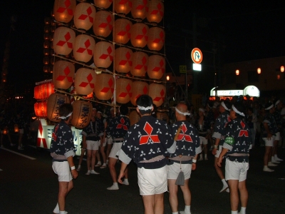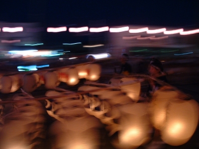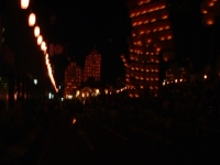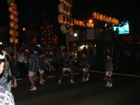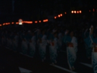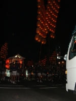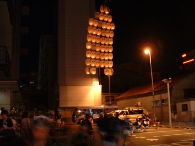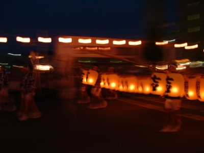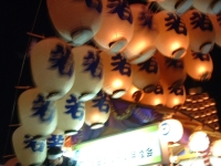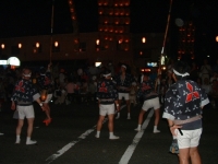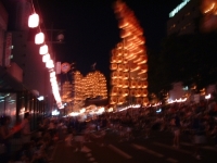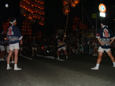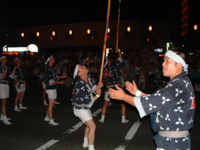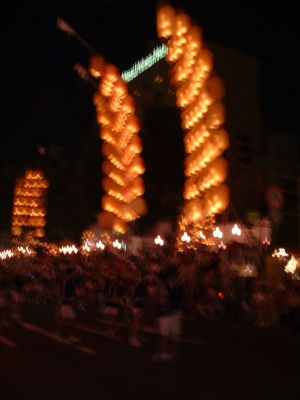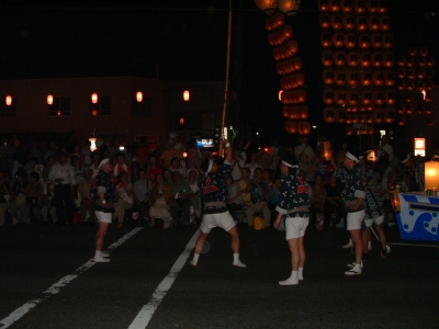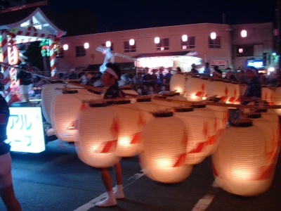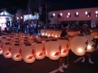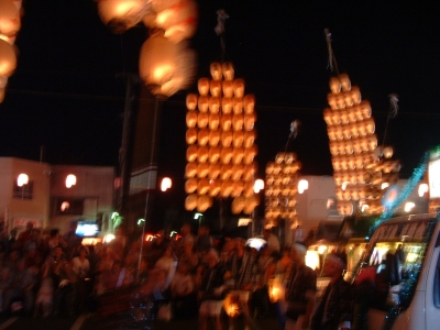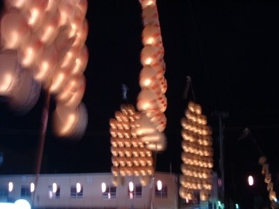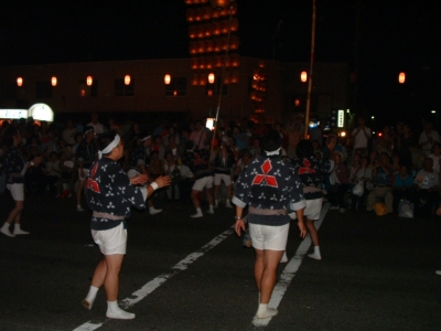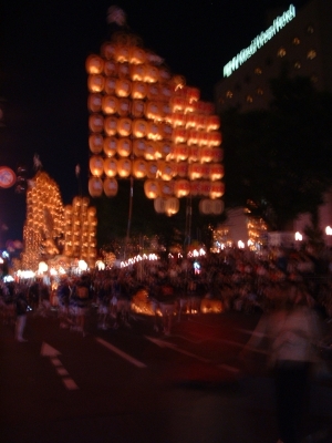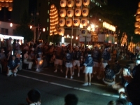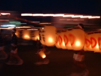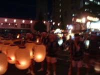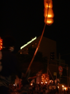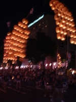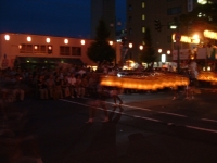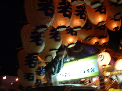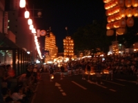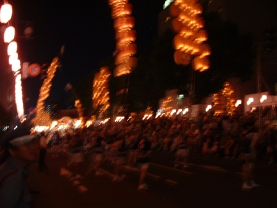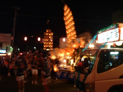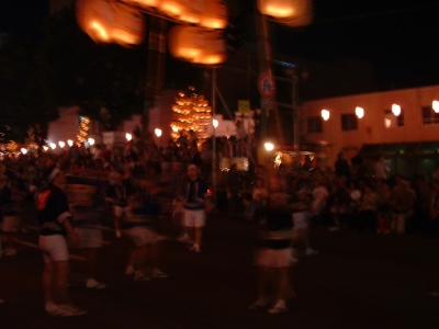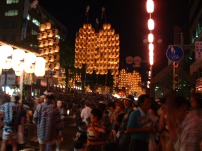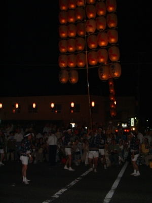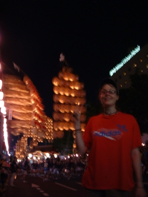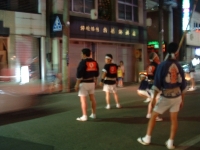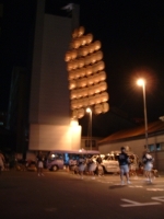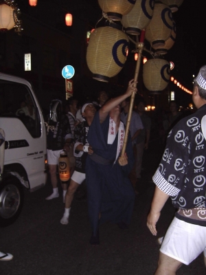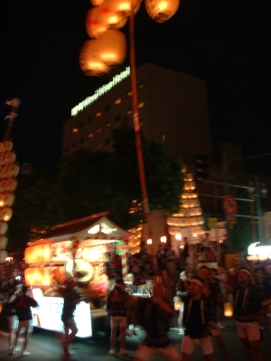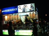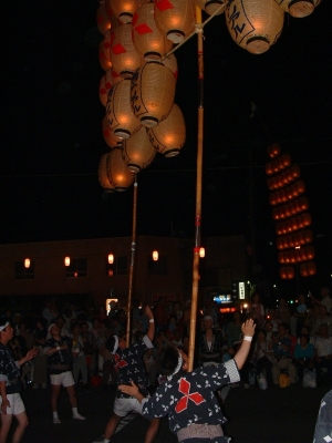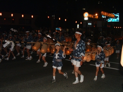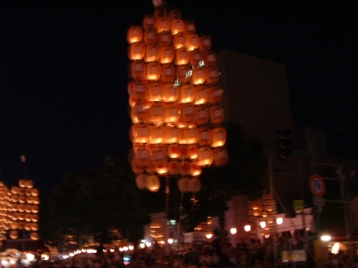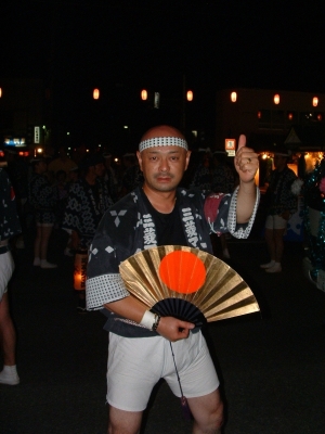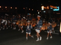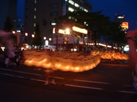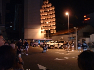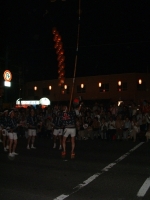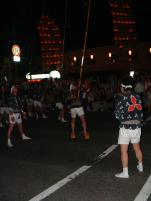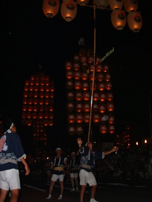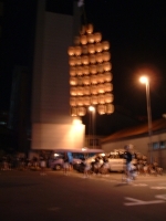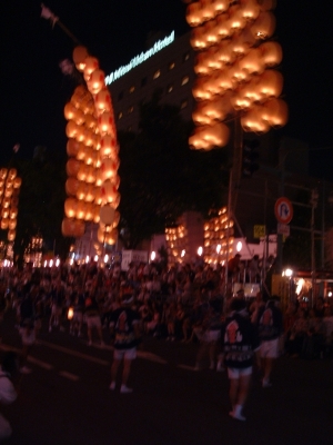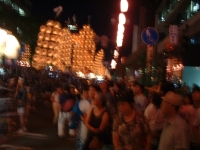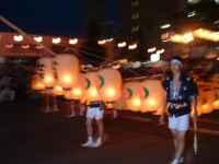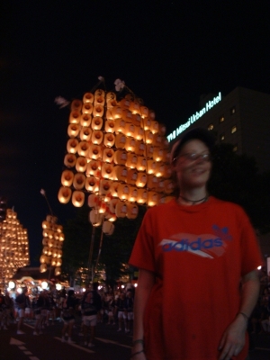 The Kanto Festival consists of balancing large poles hung with lanterns on your palm, forehead, shoulders, lower back and hips, in order of difficulty. While the poles (kanto) represent the ears and stalks of the rice plant, the lanterns themselves represent bales of rice, an important crop in Tohoku. While these men balance the poles, their drummers and flutists keep rhythm and the people in the crowd shout "Dokkoisho! Dokkoisho!". To these already unstable structures, the men keep feeding more poles under the main pole, making the whole construction taller and more tipsy. Then, to make it even harder, some of them put on single plank sandals (a sandal made like a geta, but instead of 2 small planks, there is one large one in the middle) and balance on the sandals while balancing a pole. Some also get down all the way to the ground, balancing the pole on their back, hip or shoulder. While the men make it look easy, I got a chance to try this. The poles are up to 12 meters (13 yards) tall, with 24-46 lanterns, weighing in at about 50 kilograms (110 pounds). I first tried one of the big poles. While I was able to hold it myself, I couldn't balance it at all by myself. Then I tried one of the small poles, about half the size and weight. This one I was able to balance for about 3 seconds by myself before losing it. This is nearly impossible! I have an incredible amount of respect for the men who pull this off. We got a lot of compliments for our garb, and several groups gave me items from their group, like scarves and fans. I also got invited into the NTT truck who drove me around while I played the big drums.