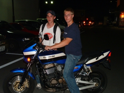 Yesterday I met my lab group under Professor Asano - Asano Lab. Hopefully it'll work out with them, they seem like a really cool bunch of folks! Asanosensei treated us to dinner at a local yakiniku, or grilled meat, place. You grill the meat over these little grils built into the tables. It was a lot of fun, and delicious! One of the guys had a really nice motorcycles, so Ben and Mike posed with it.