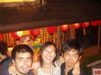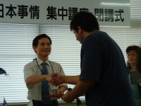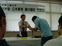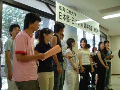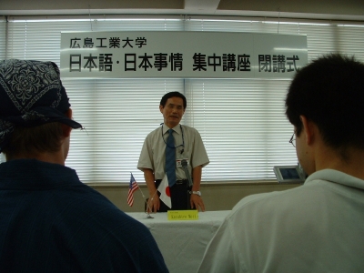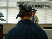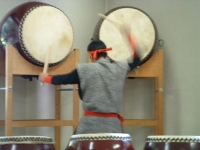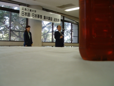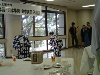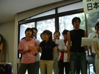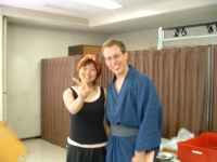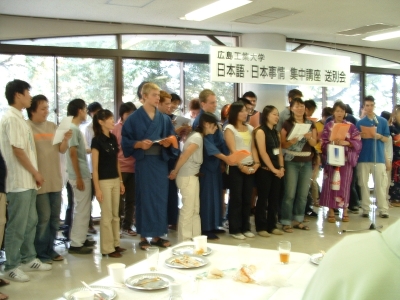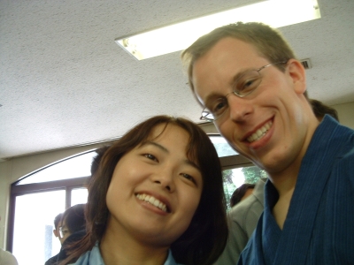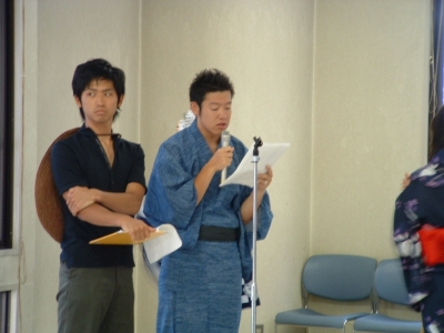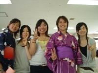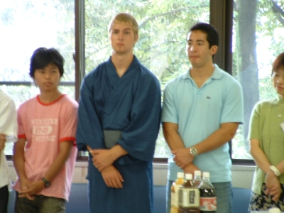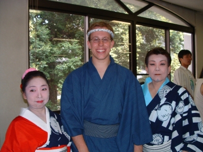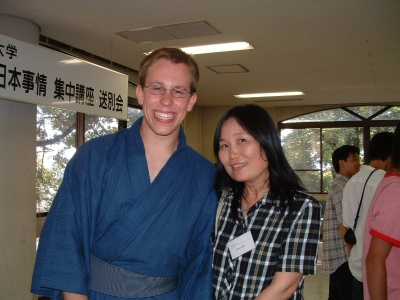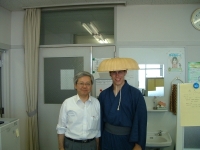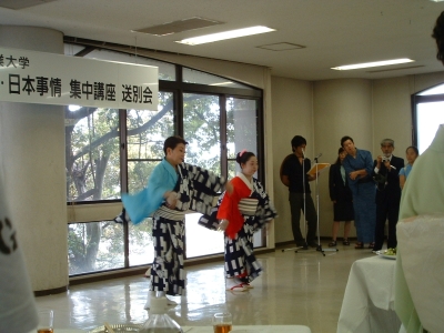 The farewell party was bittersweet. I wore my yukata and despaired about not having the right shoes (in fact, I had even forgotten my sandals, making a stockinged feet appearance very likely). However, my lab group, listening to my musings about having a pair of tabi boots (jikatabi) arrived with a gift - a set in my size! Thanks to them, I am the proud owner of one of my new favorite types of footwear - too bad I can't wear them often in the states. I had a blast talking with all of the people I met here. We also got to see some taiko drummers and a short Kabuki-style dance piece. I also got to see one of my host families again as the Kim family showed up. We then sang a few songs, then it was all over.