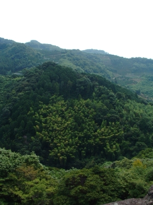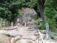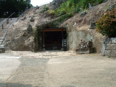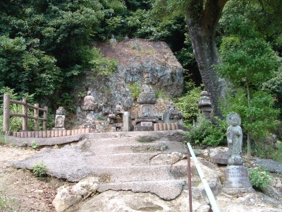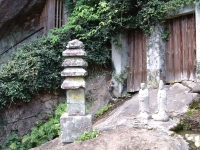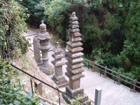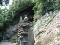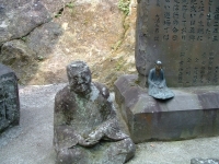 We walked deeper into the depths of Reigan-Do, and back in time. As we wound the old moss covered steps of broken rock and natural limestone, I was struck by just how remote this area was, as well as the power in the air. Around a corner lies a tall hill, with ancient Buddahs in niches set along the face. Each Buddah is unique, and there is an example of every Buddah in the Japanese system here. Some have broken, both on the face or lost the head completely. Some are so worn that it is impossible to make out their features. Yet each has its own personality and story - a minature play set in stone. At the end of the Buddahs lies the larger area set aside for the Vairochina (sp?), standing wise and absolute over the rest. The cave of Reigan-Do is set up and above, a high niche that in must have had to be climbed to enter in the days before concrete stairs were installed. It is not very large, only 10 foot by 15 foot or so, and has a beautiful view through the cedar pines towards the mountains. It is here that Miyamoto Musashi penned his famous work, Go Rin No Sho, or The Book of the Five Rings. While incorporating elements of both Buddhist and Bushido, Go Rin No Sho espouses a philosophy wholely Musashi's own - that of instantanious readiness and reaction, unconcerned with both the shade of emotion or the situation of yourself, while taking into account both. I can envision someone writing an all-encompassing work in a place like this - where nature itself surrounds everything.