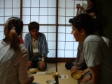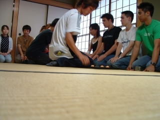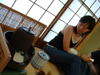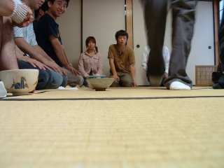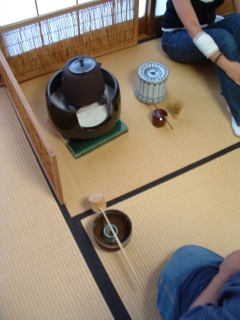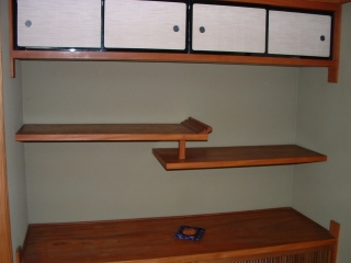 Once entering, you walk in only on stocking feet. This applies to any tatami matted area in all of Japan (and even the world - I would kill someone if they walked on a tatami I had with their shoes). The tokonoma is a focal point of the room as are the split level shelves (look up the name of these). You find a spot on the floor and sit seiza style, knees underneath you, sitting on your heels and balancing on your shins.