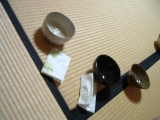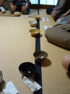 Then the tea is served - hot, freshly whisked with bamboo tools. You raise the bowl to your eyes and look at it, rotate it two 90 degree turns, drink the tea in several sips (all of it!), wipe the rim, rotate it two more 90 degree turns (same direction, counterclockwise), and set it back on the tatami. If you don't follow the protocol, it is considered very impolite.