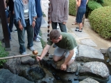 Outside the tea house, you wash before entering. The washing is both for cleanliness and ritual - there's a certain way to wash. First, you wash your left hand, then your right, then you pantomime drinking some water (you used to actually drink it, but everyone washes their hands in the same water - not clean!), then you pour the rest out via rocking the dipper up and away from you. This method of washing is repeated at many Shinto shrines.
